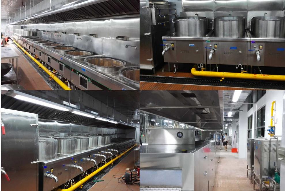 、大炒灶、中炒、蒸飯柜、工程開水機、蒸包爐。本次工程工期緊、設備種類多、數量多。經過前后一周左右的施工,所有設備都己經投入使用。