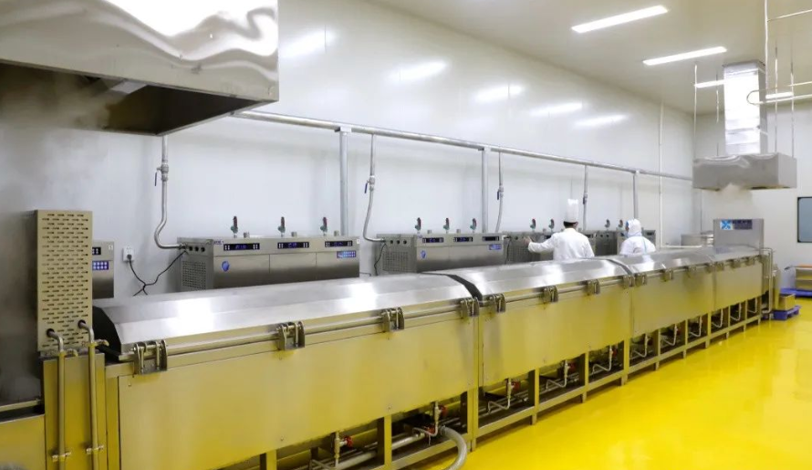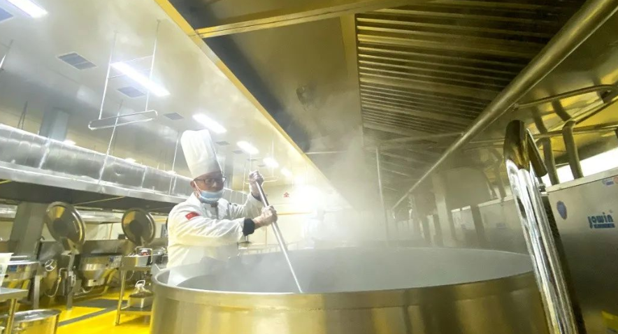 “菜品炒制過程中我們都是按照公司研發(fā)部制定的標(biāo)準(zhǔn)化菜單加工制作菜肴,實(shí)行專人專菜,保證菜品口味統(tǒng)一。這么大的廚房只需要不到20人就能完成所有配餐工作?!弊哌M(jìn)主食加工區(qū),李修見自豪的說:“米飯生產(chǎn)線使用的是T600遼寧軍艦專用米飯生產(chǎn)線,鏈條循環(huán)式加工,20分鐘生產(chǎn)可供7千至8千人食用,一條米飯生產(chǎn)線只需要一人操作,規(guī)避安全生產(chǎn)隱患,在信陽我們可是頭一家。”